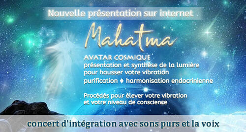 Il y a vingt-cinq ans, j'ai étudié les enseignements de Mahatma, me réunissant avec diligence en groupe chaque semaine pour méditer, expérimenter et intégrer les hautes fréquences de cet avatar cosmique. Cela ressemblait à une sorte de Woodstock, car les enseignements de Mahatma étaient nouveaux pour la planète et offraient un moyen simple mais très profond à chaque être de lumière de se connecter directement à son propre être multidimensionnel. Depuis cet été, Mahatma est venu à ma conscience, me suggérant une merveilleuse façon d'introduire ou d'assister l'intégration de cette pure Lumière Cosmique (Conscience Mahatma) pour les participants à travers les ondes sonores créées par mes concert.
